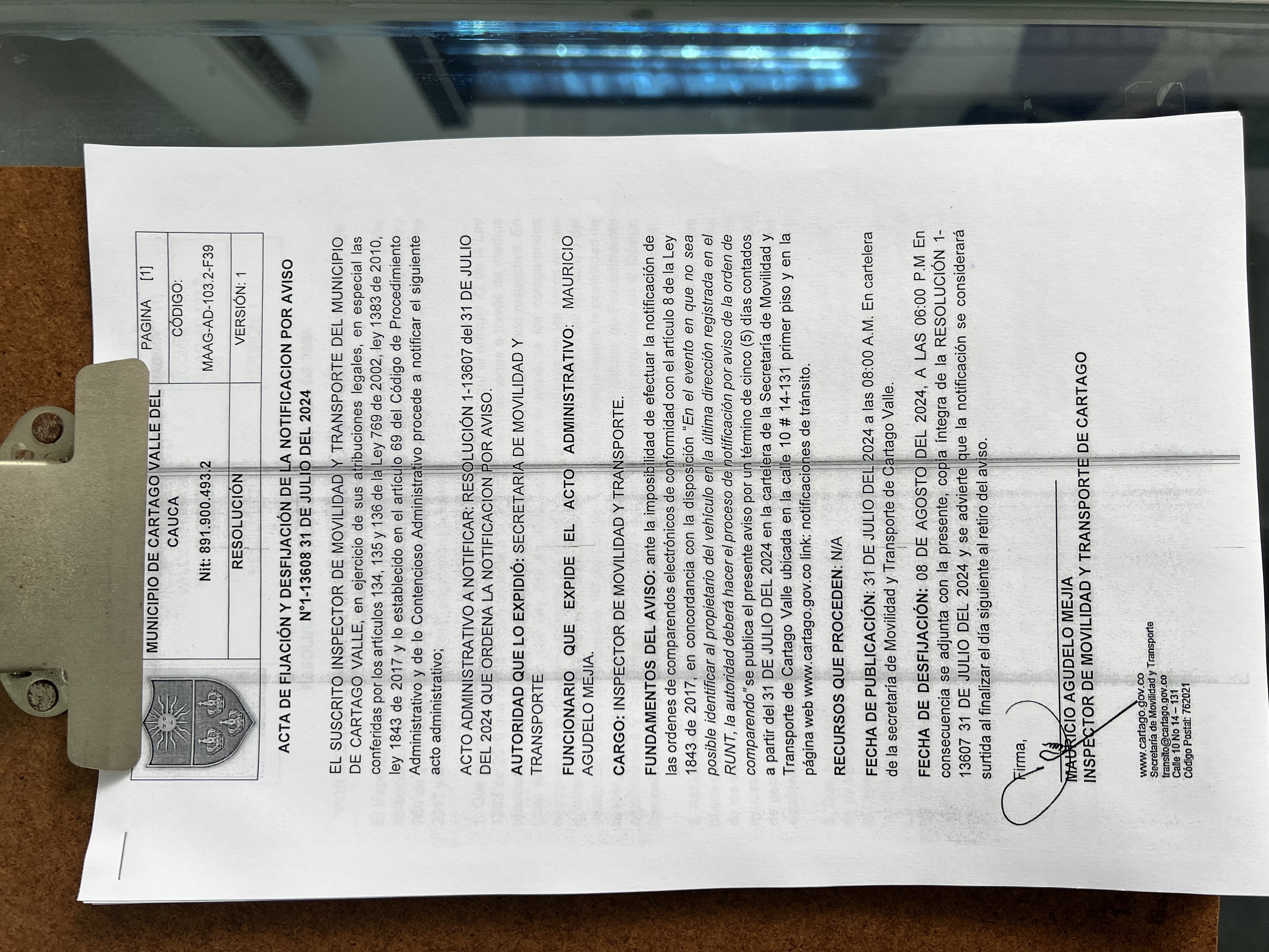 RESOLUCION No. 1-13607 DEL 31 DE JULIO DEL 2024 QUE ORDENA LA NOTIFICACION POR AVISO