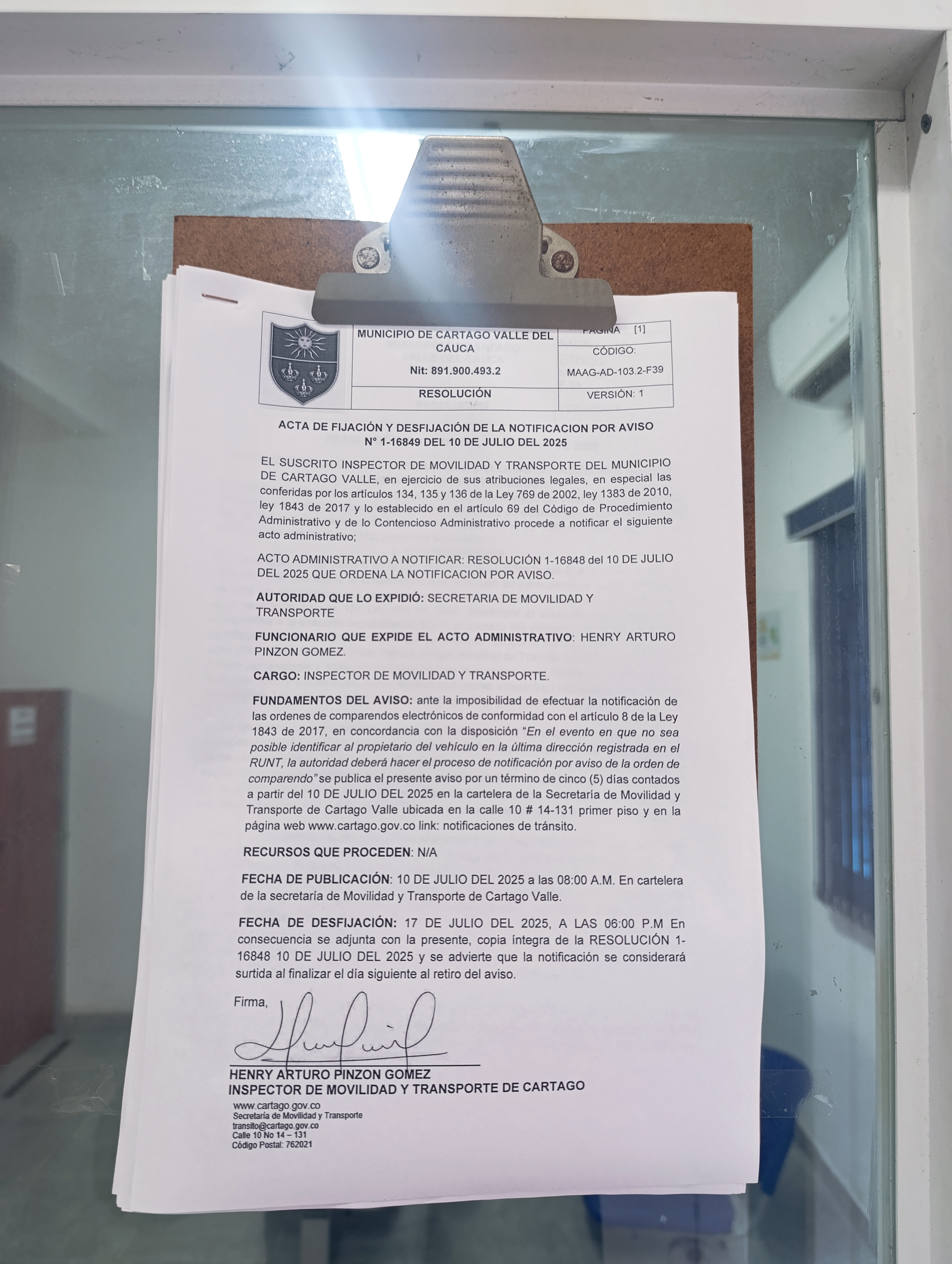 RESOLUCION No. 1-16849 DEL 10 DE JULIO DEL 2025 QUE ORDENA LA NOTIFICACION POR AVISO