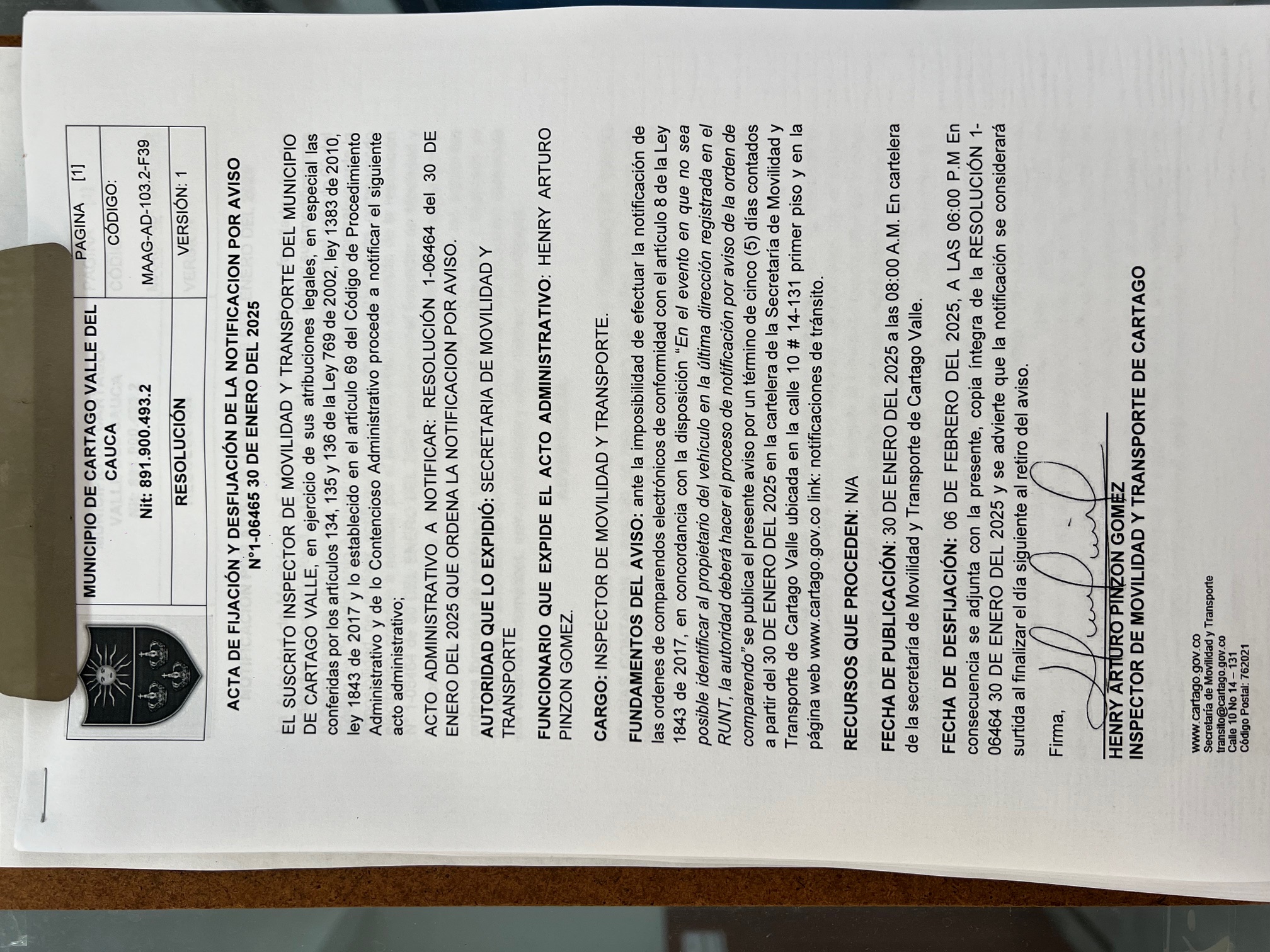 RESOLUCION No. 1-06464 DEL 30 DE ENERO DEL 2025 QUE ORDENA LA NOTIFICACION POR AVISO