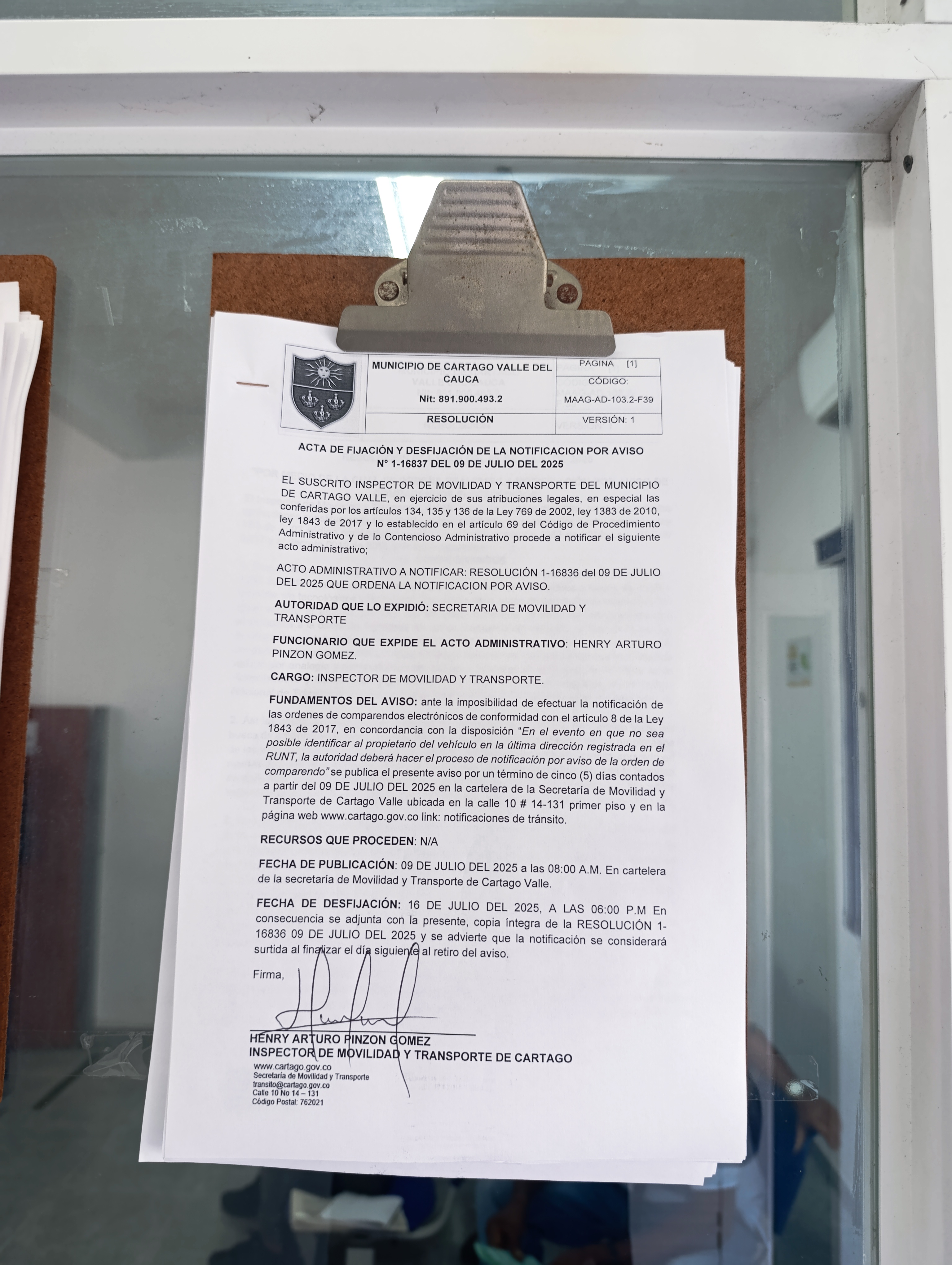 RESOLUCION No. 1-16836 DEL 09 DE JULIO DEL 2025 QUE ORDENA LA NOTIFICACION POR AVISO