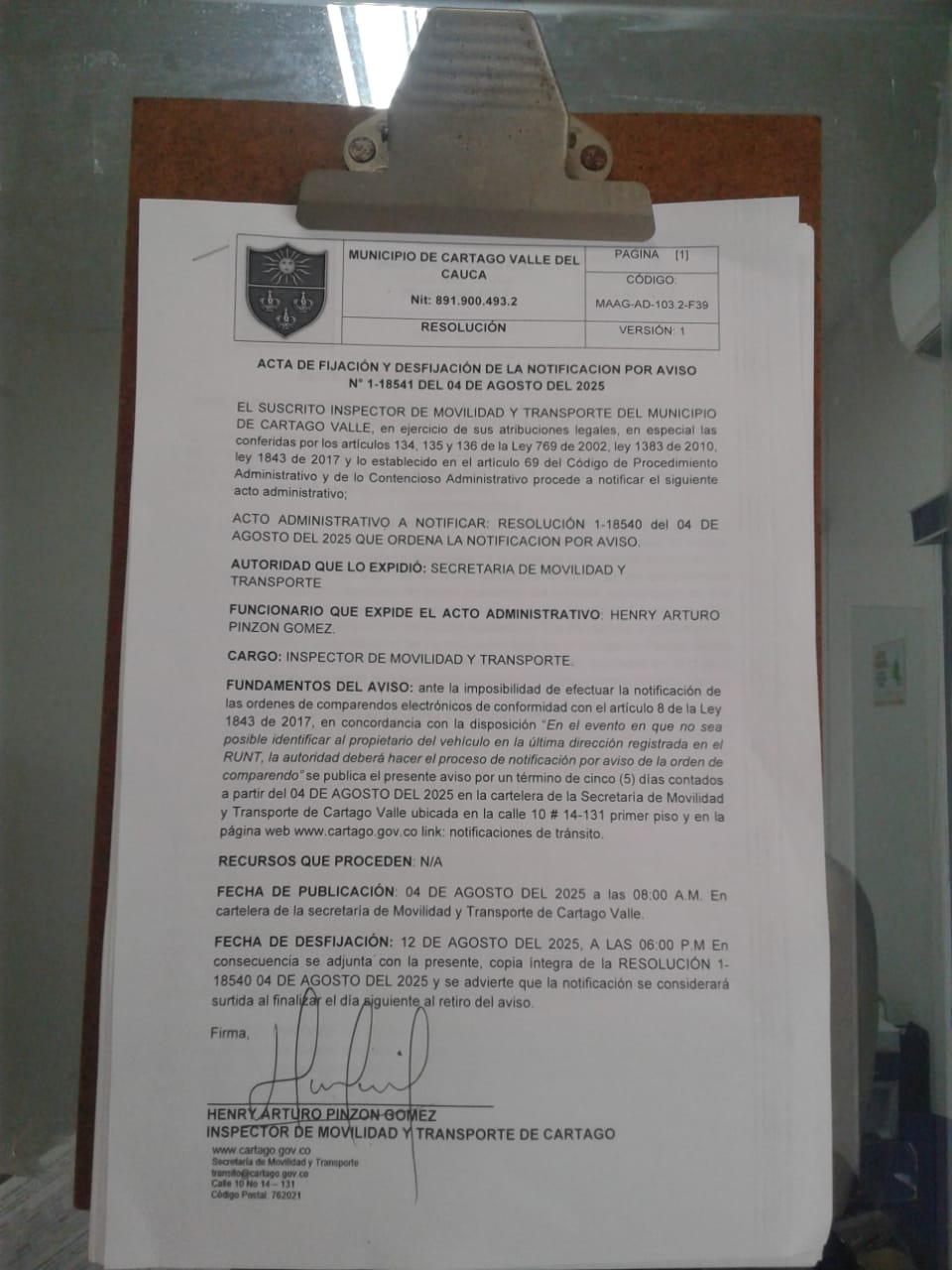 RESOLUCION No. 1-18540 DEL 04 DE AGOSTO DEL 2025 QUE ORDENA LA NOTIFICACION POR AVISO