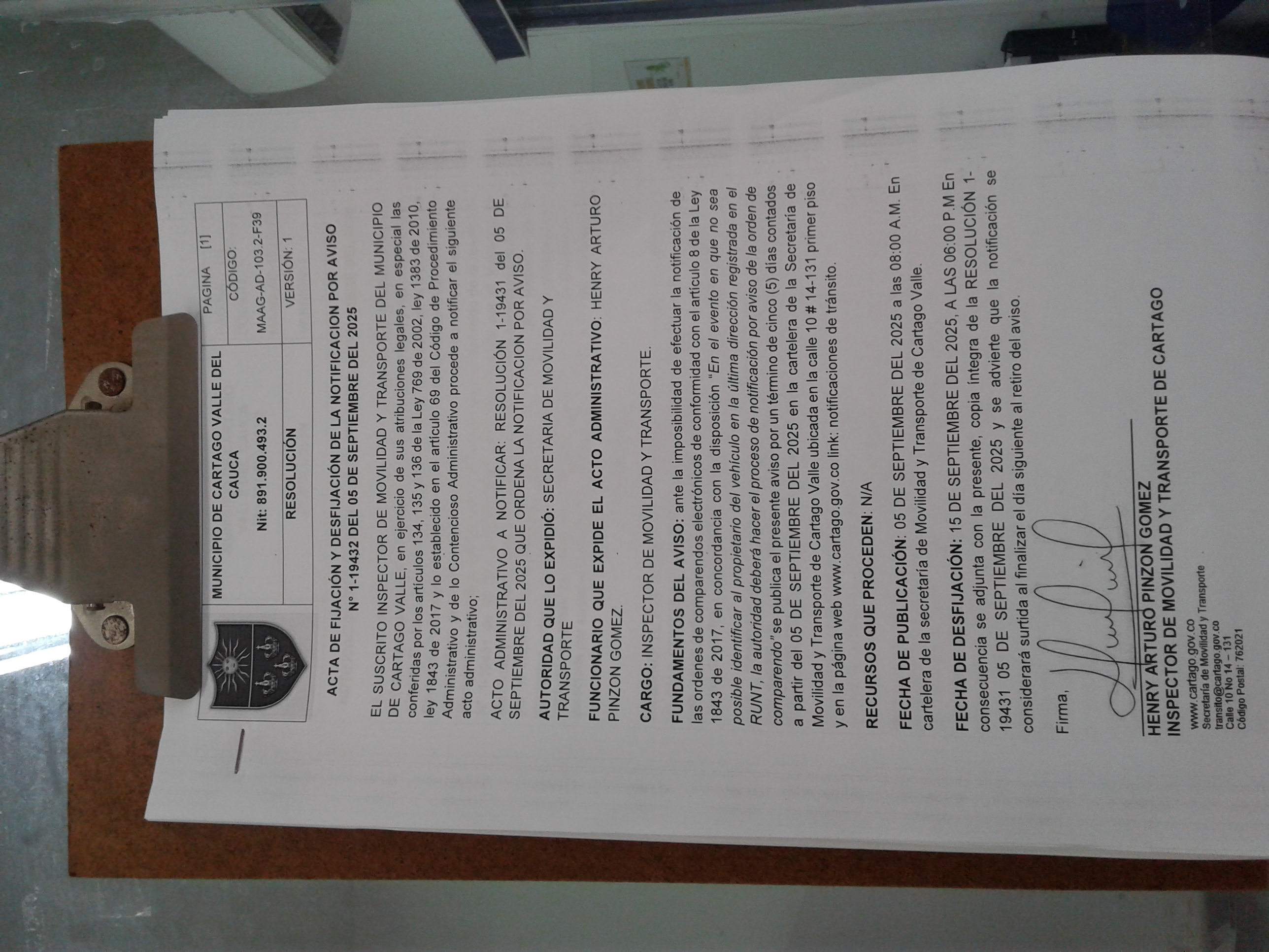 RESOLUCION No. 1-19431 DEL 05 DE SEPTIEMBRE DEL 2025 QUE ORDENA LA NOTIFICACION POR AVISO